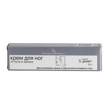 Другие формы «Крем 5 ДНЕЙ д/ног от пота и запаха»Крем для стоп от пота и запаха «5D ПЯТЬ ДНЕЙ» предназначен для ухода за ступнями ног. Применяется для устранения неприятного запаха и избыточной потливости стоп, опрелости, зуда, трещин. Смягчает сухую и загрубевшую кожу стоп. Оказывает дезинфицирующее, подсушивающее и мягкое дезодорирующее действия. Не раздражает кожу.