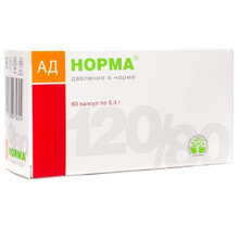АД-норма - биологически активная добавка к пище. Улучшает коронарное и мозговое кровообращение, понижает возбудимость ЦНС. АД-НОРМА понижает артериальное давление, способствует нормализации уровня холестерина в крови, улучшает кровообращение сердца и головного мозга. Арония черноплодная: оказывает гипотензивное действие. Применяется при 1-2 стадиях гипертонической болезни. Благодаря содержанию сорбита рекомендуется при сахарном диабете.Содержит большое количество органических кислот, витамины С, В2, Е, РР, Р-витаминный комплекс. Боярышник кроваво-красный: содержит широкий спектр БАВ преимущественного кардиотропного действия. Обладает кардиотоническим и антиаритмическим действием - применяется при сердечной недостаточности I-II стадий, тахикардии, мерцательной аритмии. Улучшает коронарное кровообращение. Применяется при кардионеврозах, повышенной возбудимости.