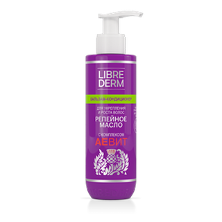 Другие формы «Librederm»После мытья волос шампунем «Репейное масло» для укрепления и роста волос с комплексом АЕВИТ LIBREDERM нанесите бальзам-кондиционер на влажные волосы и кожу головы. Распределите по всей длине и оставьте на 3-5 минут. Затем смойте большим количеством воды.