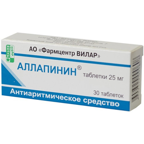 Аллапинин вызывает замедление предсердно-желудочковой и внутрижелудочковой проводимости, укорачивает эффективный и функциональный рефрактерные периоды в предсердиях и желудочках. Оказывает умеренное спазмолитическое, коронарорасширяющее, холинолитическое и седативное действие. Биодоступность составляет 39% - подвергается интенсивной пресистемной биотрансформации. При в/в введении и приеме внутрь период полувыведения - 1-1,2ч. Проникает через ГЭБ. Один из трех основных метаболитов понижает артериальное давление. При приеме внутрь эффект развивается через 40-60 мин, достигает максимума через 4-5 ч и продолжается 8 ч и более. В условиях в/в введения антиаритмическое действие проявляется через 15-20 мин и длится 6-8 ч (с максимумом через 2 ч). Удлинение периода полувыведения отмечено при длительном применении, почечной недостаточности (в 2-3 раза), циррозе печени (в 3-10 раз).