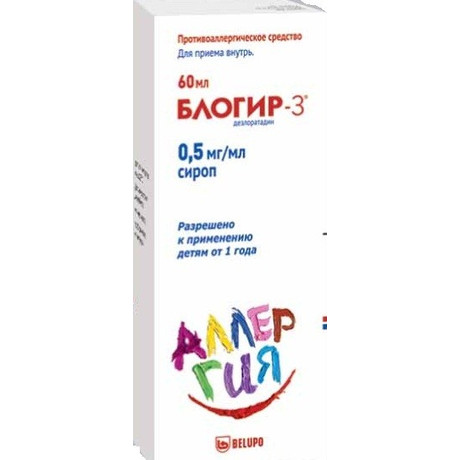 1 мл сиропа Блогир-3 содержит дезлоратадин 0,5 мг.
