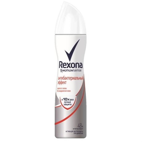 Другие формы «Дезодорант REXONA»Антиперспирант REXONA Антибактериальный эффект – это самая надежная и долговременная защита от запаха пота и некрасивых пятен на одежде. Уникальная современная формула обеспечивает до 10 раз более мощный эффект, препятствуя развитию и размножению микроорганизмов, вызывающих образование неприятных запахов, а безопасные и гиппоаллергенные компоненты исключают появление раздражения на нежной коже подмышек. Удобная форма выпуска в виде спрея проста в использовании, дезодорант моментально высыхает на коже, избавляя от ощущения липкости.