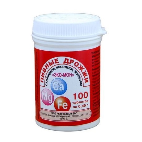 Другие формы «Дрожжи пивные»Пивные дрожжи с кальцием, магнием и железом "Эко-Мон" (100 таб.) — рекомендуются в качестве дополнительно источника витамина В и микроэлементов: железа, магния и кальция. Способствуют укреплению костной и хрящевой ткани, мышц, нормализуют деятельность нервной, сердечно-сосудистой систем и желудочно-кишечного тракта, повышают иммунитет, увеличивают сопротивляемость организма заболеваниям, предупреждают усталость.