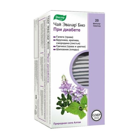 Другие формы «Чай лечебный ЭВАЛАР»Чай Эвалар Био при диабете изготавливают измельчением и отсевом, с последующим дозированием в фильтр-пакеты смеси: галеги травы, шиповника плодов, гречихи травы и цветков, брусники листьев, смородины листьев, крапивы листьев, с добавлением ароматизатора натурального «Черная смородина»