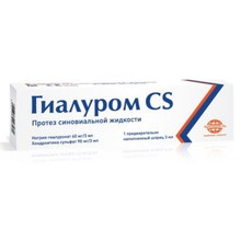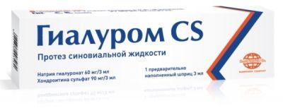 Гиалуром CS – протез синовиальной жидкости, стерильный, прозрачный вязкоэластичный раствор, в состав которого входят гиалуронат натрия 60 мг/3 мл и хондроитин сульфат натрия 90 мг/3 мл (зарегистрирован в РФ от 10.09.2008г. № РУ П N014581/01).