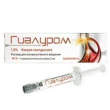 Раствор для внутрисуставного введения ГИАЛУРОМ - 1,5 % раствор натрия гиалуроната в одноразовых шприцах по 2 мл представляет собой стерильный, вязкоэластичный раствор гиалуроната натрия. Гиалуронат натрия получен в результате брожения. Гиалуронат натрия ГИАЛУРОМ представляет собой полисахарид идентичный человеческому, состоит из повторяющихся дисахаридных звеньев N-ацетилгликозамина и глюкуроната натрия, с молекулярной массой, превышающей 2 400 000 Да. Натрия гиалуронат присутствует повсеместно в организме человека и присутствует в больших концентрациях в тканях, таких как стекловидное тело, синовиальной жидкости, пуповине и дерме. В синовиальной жидкости гиалуронат натрия выступает как смазка и поглотитель удара, что способствует нормальному движению без боли. При заболевании типа артрита, вязкоупругость синовиальной жидкости снижается, так что значительно увеличивает механическую нагрузку на сустав и усиливается разрушение суставного хряща, проявляется ограничением и болями при движении в суставах. Смазывающее и амортизирующее действие этого препарата смягчают боли и улучшают подвижность сустава при внутрисуставном применении. Данные эффекты продолжаются более 6 месяцев после одного курса лечения.