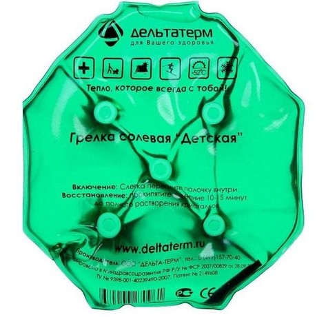 Солевая грелка "Детская" изготовлена в форме восьмигранника, что дает возможность ее моделирования для различных ситуаций. Предназначена для прогревания грудной клетки при бронхите, трахеите, ОРЗ.