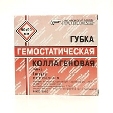 Губка гемостатическая коллагеновая размером (90 ± 5) х (90 ± 5) мм, толщиной 7±2 мм в блистере. Стерильно.