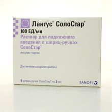 Лантус СолоСтар - шприц-ручка с Инсулином гларгин. Инсулин гларгин является аналогом человеческого инсулина, полученным методом рекомбинации ДНК бактерий вида Escherichia coli (штаммы К12). Отличается низкой растворимостью в нейтральной среде. В составе препарата Лантус СолоСтар он полностью растворим, что обеспечивается кислой средой раствора для инъекций (рН=4). После введения в подкожно-жировую клетчатку раствор вследствие своей кислотности вступает в реакцию нейтрализации с образованием микропреципитатов, из которых постоянно высвобождаются небольшие количества инсулина гларгина, обеспечивая плавный (без пиков) профиль кривой "концентрация-время", а также пролонгированное действие препарата.