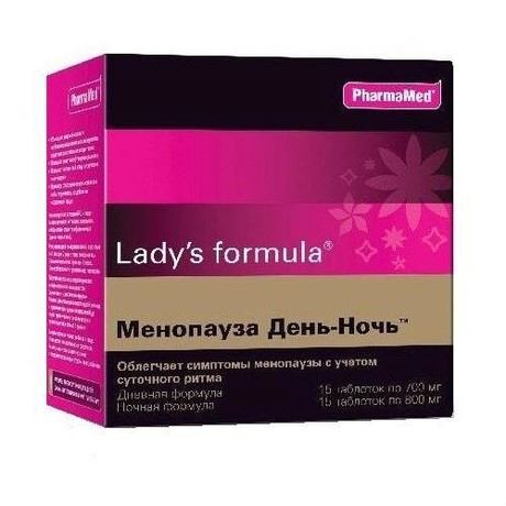 ЛЕДИ-С ФОРМУЛА "МЕНОПАУЗА ДЕНЬ-НОЧЬ" - это натуральный биологически активный комплекс, состоящий из дневной и ночной формул и позволяющий контролировать самочувствие женщины 24 часа в сутки. Благодаря его действию достигается оптимальный баланс и естественный ритм деятельности органов женской половой системы в переходный период. Препарат устраняет симптомы пре- и менопаузы, обеспечивает хорошее физическое самочувствие и душевное равновесие, днем придает дополнительную энергию и увереннность, а ночью восстанавливает нормальный сон.