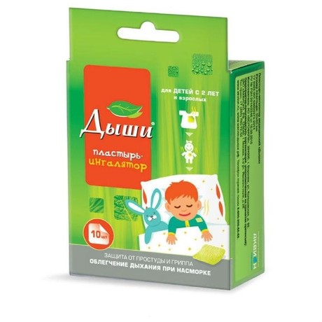 Пластырь для ингаляций, клеящийся на одежду. Эфирные масла, испаряющиеся в процессе применения пластыря, способствуют профилактике простудных заболеваний, облегчению их симптомов, нормализации дыхания при заложенности носа. Способствует облегчению симптомов простуды, облегчает засыпание. Действие одного пластыря длится до 8 часов. Если у ребенка насморк, то не беспокоя ребенка, можно наклеить пластырь-ингалятор Дыши на одежду для облегчения дыхания. Благодаря удобному способу применения лечение можно проводить не только днем, но и ночью. Во время сна ребенок может крепко спать и дышать носом.
