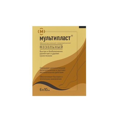 ЛЕЙКОПЛАСТЫРЬ МУЛЬТИПЛАСТ МОЗОЛЬНЫЙ оказывает кератолитическое (отшелушивающее) действие приводит к размягчению и удалению сухой мозоли или натоптыша, а также антимикробное, противовоспалительное, противозудное и обезболивающее действие.