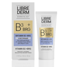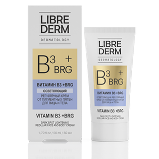 Крем для лица и тела BRG + ВИТАМИН В3 LIBREDERM® помогает поддерживать и продлевать эффект осветления пигментных пятен после интенсивных процедур устранения пигментных пятен. Крем позволяет контролировать воспалительные процессы, уменьшая покраснения, защищает клеточную ДНК от УФ-излучений, оказывает антиоксидантную защиту клеток. Благодаря биоактиву в составе сыворотки содержание меланина в области гиперпигментации сокращается на 31%, выравнивается тон кожи. подтверждено тестами in vitro