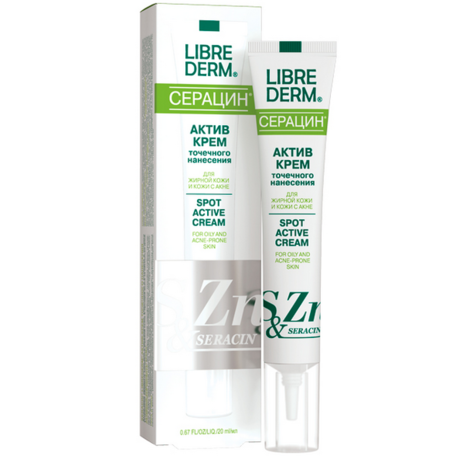 Актив-крем точечного точечного нанесения Серацин Librederm® Крем-актив наносится непосредственно на прыщи, акне и предназначен для уменьшения, а при регулярном использовании до полного устранения видимых элементов угревой сыпи и прыщей всего за несколько дней. Салициловая кислота, благодаря своей гидрофобности, способна глубоко проникнуть в поры через слой кожного себума, отшелушивая клетки, скопившиеся внутри сальных желез и закупоривающих ее. В свободную от отмерших клеток пору попадают компоненты крема, оказывающие антибактериальное воздействие. Сера и цинк обладают антибактериальной активностью, регулируют выработку секрета сальных желез, уменьшают покраснения и неприятные ощущения, сопутствующие акне.