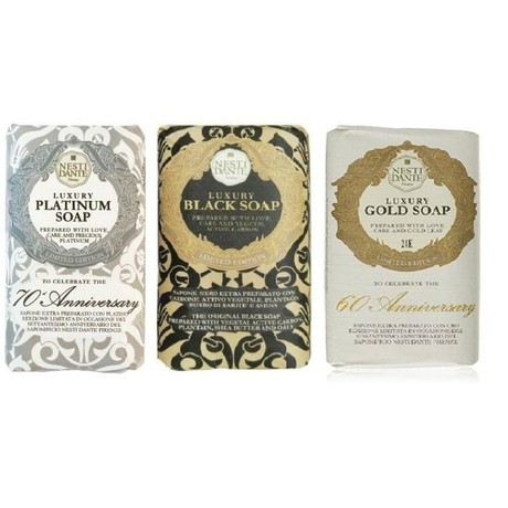 Другие формы «Мыло NESTI »Набор состоит из 3-х кусков мыла Золотой «слиток» Luxury Gold Soap 60th Anniversary был выпущен к юбилею создания компании. Мыло содержит настоящее золото 23 карата, аромат ириса + мыло Luxury Platinum Soap содержащее драгоценную платину, которая, благодаря своим качествам, высоко ценится нетолько в ювелирной области, но и в медицине. Платина способнаудерживать влагу на коже, гарантируя естественное ощущениечистоты. Также она является природным антиоксидантом, придает коже упругость и здоровой вид. + Luxury Black Soap. Мыло выпущено ограниченным количеством по оригинальной рецептуре, которуютщательно оттачивали несколько поколений мыловаров. Полезные свойства золы растений с африканских плантаций, коры истручков какао способствуют увлажнению и обновлению клеток кожи, улучшают кровообращение. Масло ши помогает коже обрести былую мягкость и свежесть.