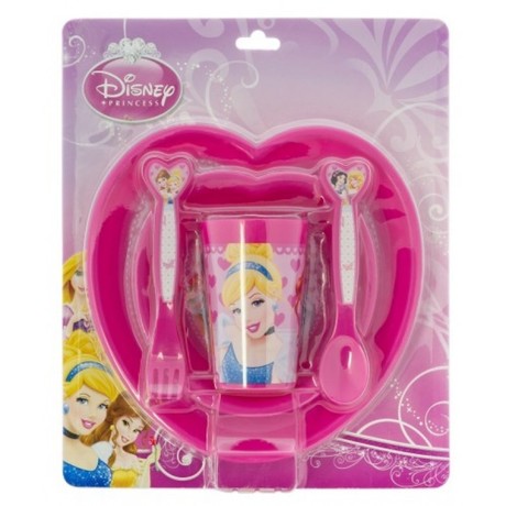 В комплект входят: стакан (270 мл), тарелка (диаметр 23 см) и глубокая тарелка (диаметр 17 см), ложечка и вилочка. Все предметы выполнены в оригинальном дизайне с изображениями принцесс Disney. Набор упакован в коробку из плотного картона.