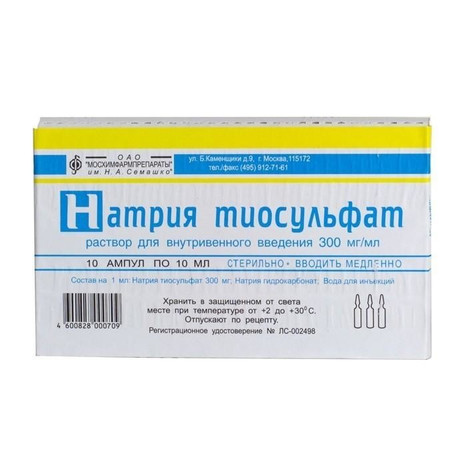 1 ампула с 10 мл раствора для инъекций содержит натрия тиосульфата 3 г