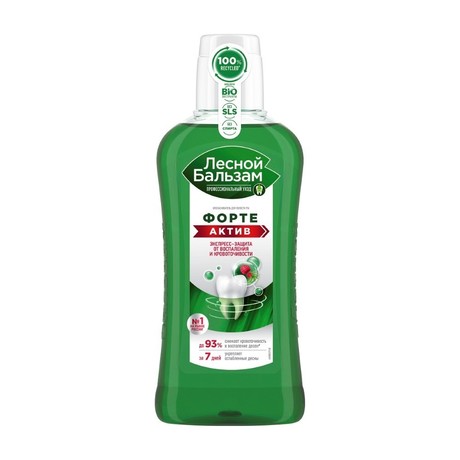 Бренд Лесной бальзам - это проверенные продукты, способствующие снижению воспаления, кровоточивости десен и обеспечивающие качественную профилактику основных проблем полости рта в домашних условиях. Лесной Бальзам ополаскиватель на отваре трав Форте Актив. Внешний вид и свойства: Текстура продукта: жидкая Форма продукта средства (концентрата): Гель, жидкость Цвет продукта: Зеленый - темно-зеленый. Вкус: Масло чайного дерева и отвар трав. Особенности состава: Содержит тройную концентрацию отвара трав и масло чайного дерева Против всех видимых проблем десен, для ежедневной защиты от воспалений Содержит хвойный комплекс с тройной концентрацией отвара трав, 8 фитоэкстратов и масло чайного дерева Обладает выраженным хвойным вкусом В 2 раза снижает воспаление и кровоточивость десен (по результатам клинических исследований 2016) В 4 раза улучшает иммунитет полости рта и поддерживает баланс микрофлоры (по результатам клинических исследований 2016) Рекомендован стоматологами при воспалении, кровоточивости или общем ослаблении десен. Результат: Против всех видимых проблем десен, для ежедневной защиты от воспалений.