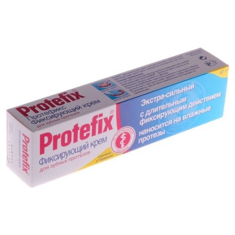 Фиксирующий крем Protefix (Протефикс) Гипоаллергенный не содержит красителей и вкусовых добавок. Рекомендуется для надежной фиксации зубных протезов при повышенном и нормальном слюноотделении. Он легко наносится, сохраняет свои свойства под воздействием горячей и холодной пищи, не меняет вкус еды и напитков, не оказывает негативного воздействия на желудок. Не смывается слюной и равномерно распределяется по всей прилагающей к десне поверхности.