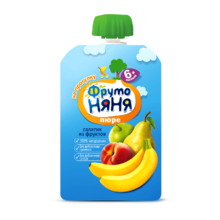 Состав: пюре из бананов, пюре из груш (концентрированное), пюре из яблок, пюре из персиков (концентрированное).
