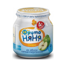 Пюре ФрутоНяня Яблоко готовится из зеленых яблок без добавления сахара, что снижает риск развития пищевой аллергии. Органические кислоты, поступающие в организм ребенка вместе с легким яблочным пюре, имеют особое значение для детей первого года жизни. А пектин, содержащийся в яблоках, положительно влияет на деятельность желудочно-кишечного тракта, способствуя процессу пищеварения.