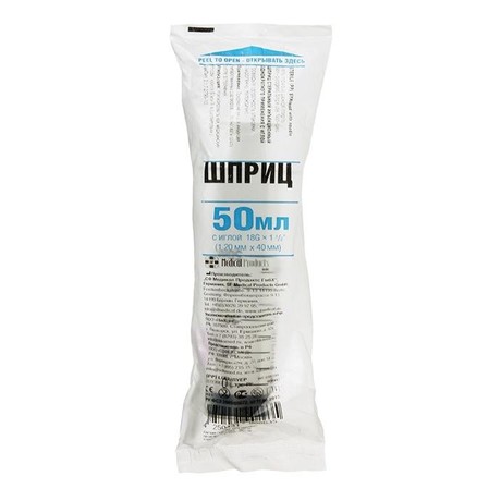 Другие формы «Шприц одноразовый »Шприц инъекционный однократного применения 3-х компонентный 50 мл с иглой 1,2 х40 мм. Шкала на цилиндре нанесена несмываемой краской. Упаковка полибэг (исключается попадание волокон упаковочной бумаги на детали шприца и иглу).
