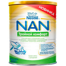 Другие формы «Смесь молочная НАН»Молочная смесь NAN Тройной комфорт с рождения 400 г. Смесь NAN Тройной комфорт – питание, предназначенное для устранения основных симптомов функциональных расстройств пищеварения. Благодаря особой комбинации компонентов смесь NAN Тройной комфорт способствует устранению младенческих кишечных колик и запоров; нормализует пищеварение; способствует улучшению состава кишечной микрофлоры. Подходит для использования в качестве единственного источника питания для детей с рождения и до 6 месяцев. Смесь обеспечит ребенка всеми питательными веществами, необходимыми для его оптимального роста и развития. Лактобактерии L.reuteri – активная пробиотическая культура, которая способствует налаживанию процессов пищеварения, снижению интенсивности плача у детей с младенческими коликами, уменьшению частоты срыгиваний, увеличению частоты стула и улучшению его консистенции, а также способствует становлению здоровой кишечной микрофлоры ребенка. Пребиотики ГОС и ФОС - пищевые волокна, благотворно влияющие на организм ребенка, способствующие формированию регулярного мягкого стула и улучшению состава кишечной микрофлоры. Умные липиды DHA и ARA - 2 особые жирные кислоты, присутствующие в грудном молоке, играют важную роль в становлении иммунной системы малыша и способствуют развитию мозга и зрения. Optipro HA - разработанный по специальной технологии частично гидролизованный гипоаллергенный белковый комплекс, который легко усваивается.