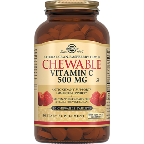 Другие формы «Солгар»Таблетки "Витамин С 500 мг с Малиновым вкусом" рекомендуются в качестве биологически активной добавки к пище - дополнительного источника витамина С (СанПиН 2.3.2.1290-03 п.2.1). Витамин С обладает антиоксидантным действием, способствует повышению устойчивости организма к инфекциям, способствует синтезу коллагена, укреплению стенок сосудов, уменьшению развития кровоточивости десен и появления синяков.