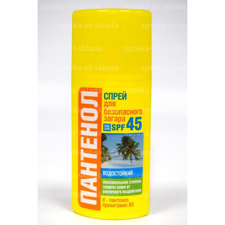 Другие формы «Спрей Пантенол для загара»Спрей ПАНТЕНОЛ легко наносится и распределяется по коже, обеспечивая надежную защиту кожи от UVB и UVA лучей. Обеспечивает профилактику солнечных ожогов и раздражения. Рекомендован в первые дни пребывания на солнце и при высокой солнечной активности.