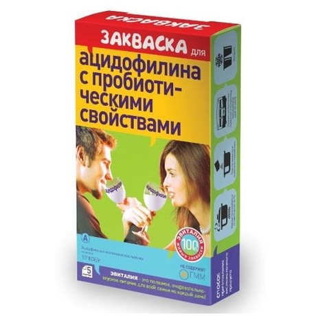 Другие формы «Закваска Эвиталия»Предлагаемый продукт – Закваска для приготовления Ацидофилина с пробиотическими свойствами, состоит из пробиотической и пребиотической микрофлоры, - живых микроорганизмов, способствующих сохранению и восстановлению нормального состава кишечной микрофлоры, а также веществ, создающих условия роста для нормальной микрофлоры кишечника.