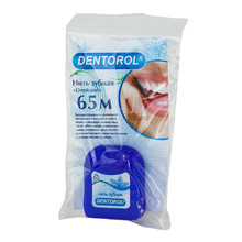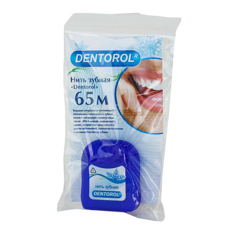 Зубная нить «Денторол» выпускается длиной 65 м в полиэтиленовом пакете вместе с пластиковым держателем. На сегодняшний день это самая длинная нить в подобной упаковке! Нить «Денторол» мятная, вощеная натуральным воском, обладает антисептическим действием, устойчива на разрыв и мягка для десен.