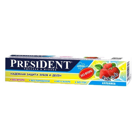 Другие формы «Зубная паста детская ПРЕЗИДЕНТ»Детская зубная паста PresiDent Kids со вкусом клубники предназначена для ухода за молочными зубками у малышей от 3 до 6 лет. В этом возрасте малыш знакомится со многими новыми вкусами, поэтому его зубки подвергаются серьзной нагрузке и требуют качественной защиты, обеспечить которую может правильная зубная паста.